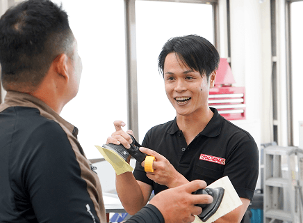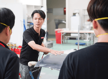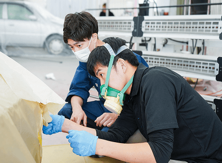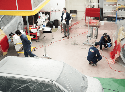 従来の板金塗装では車両を工場にあずける必要がありましたが、特許取得済みの組み立て式ブースと環境に配慮した水性塗料の採用により、出張先での施工を実現しました。納期を大幅に短縮できる出張カーリペア技術は、中古車市場で急速に広がり、ニーズに対して人材が不足しています。