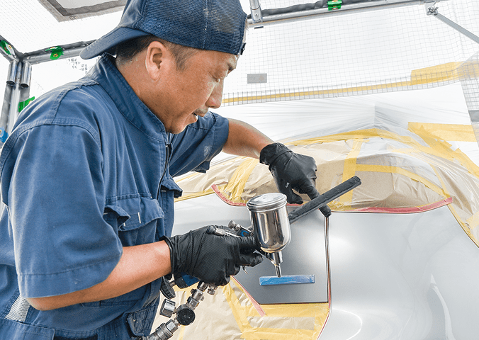 従来の板金塗装では車両を工場にあずける必要がありましたが、特許取得済みの組み立て式ブースと環境に配慮した水性塗料の採用により、出張先での施工を実現しました。納期を大幅に短縮できる出張カーリペア技術は、中古車市場で急速に広がり、ニーズに対して人材が不足しています。